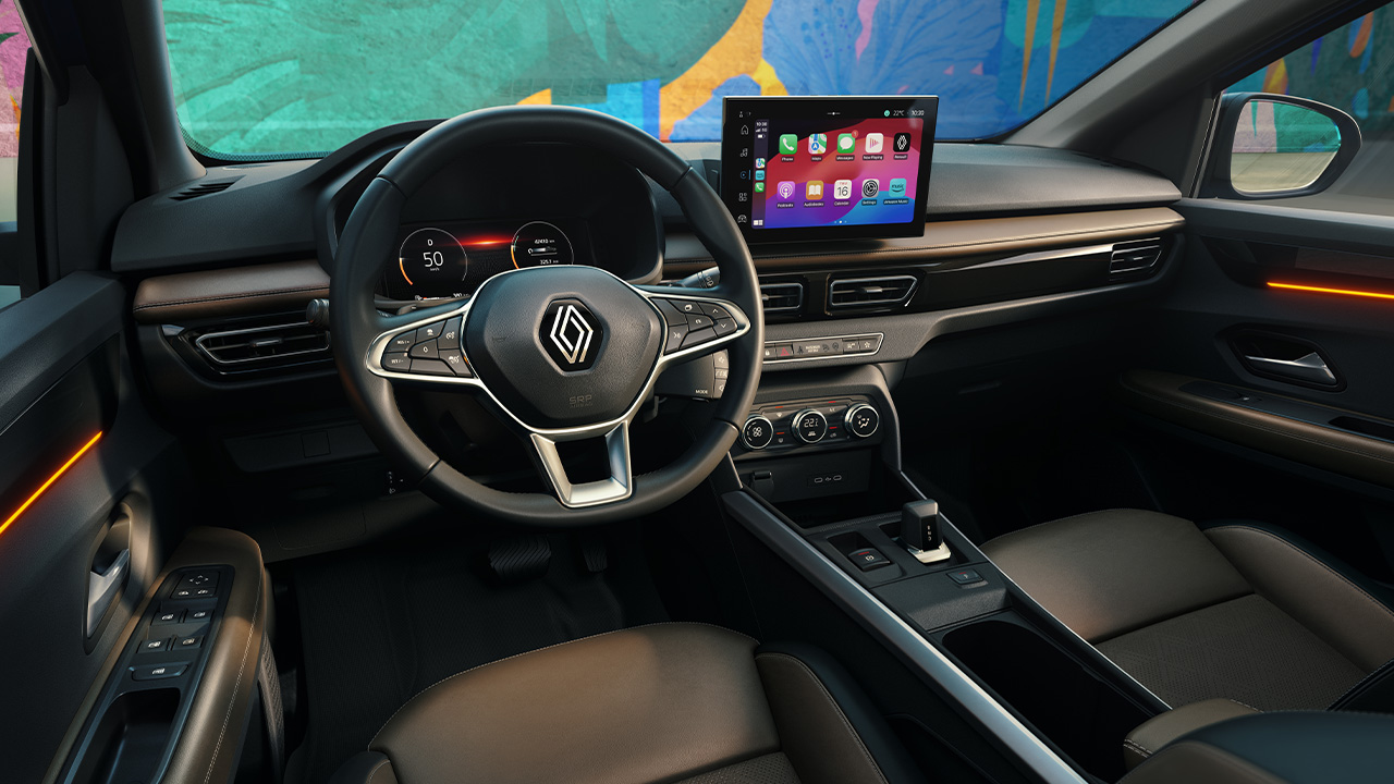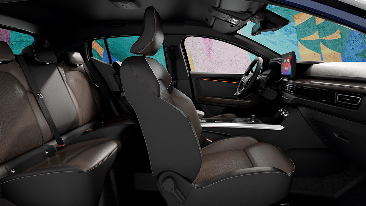 Junto con su completo equipamiento, Renault Kardian ofrece un confort refinado con asientos de materiales premium con acabado texturizado, mientras que los elegantes detalles y la iluminación ambiental realzan el diseño del habitáculo. Un cargador inalámbrico mantiene tu smartphone cargado. El confort se extiende a la parte trasera, donde los pasajeros disfrutan de un espacio generoso.